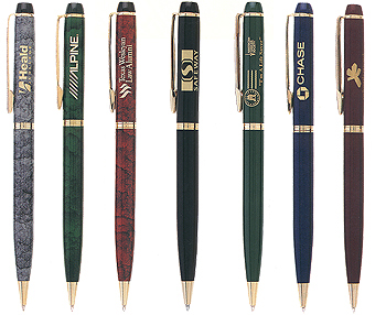 This Twist Action Barrel Ballpoint pen is elegant and sophisticated in design, and is made from solid brass. Some of the features of this pen include a twist-action feature that allows the ballpoint to retract (no lost or misplaced cap) which makes the pen easy to use. The pen comes in a choice of an elegant marble design or a shiny solid color, both with a gloss coated barrel. Also this pen features a solid brass clip and gold trim accents. Make a statement of class and elegance to your client base, or give a ways for corporate gifts, trade shows, or conventions, with your custom message or logo on this Twist Action Barrel Ballpoint pen. |